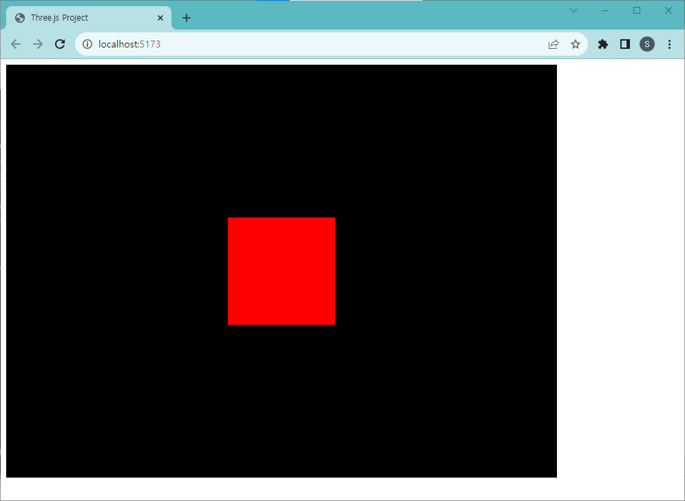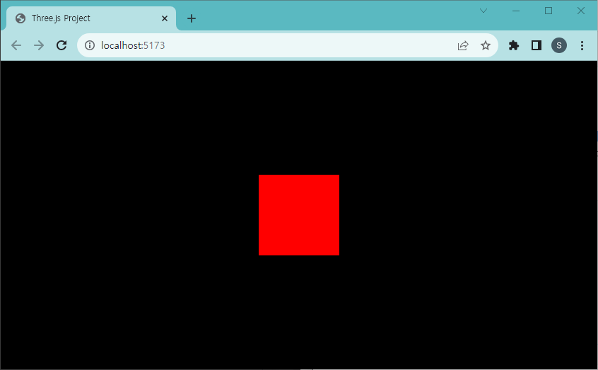 - 위의 코드를 모두 입력하면 다음과 같이 800px * 600px 화면에 빨간색 박스 하나가 나타난다. 3D 박스 지오메트리를 만들었으나 정면에서 바라보는 각도 때문에 마치 2D 정사각형을 만든 것처럼 보인다.
