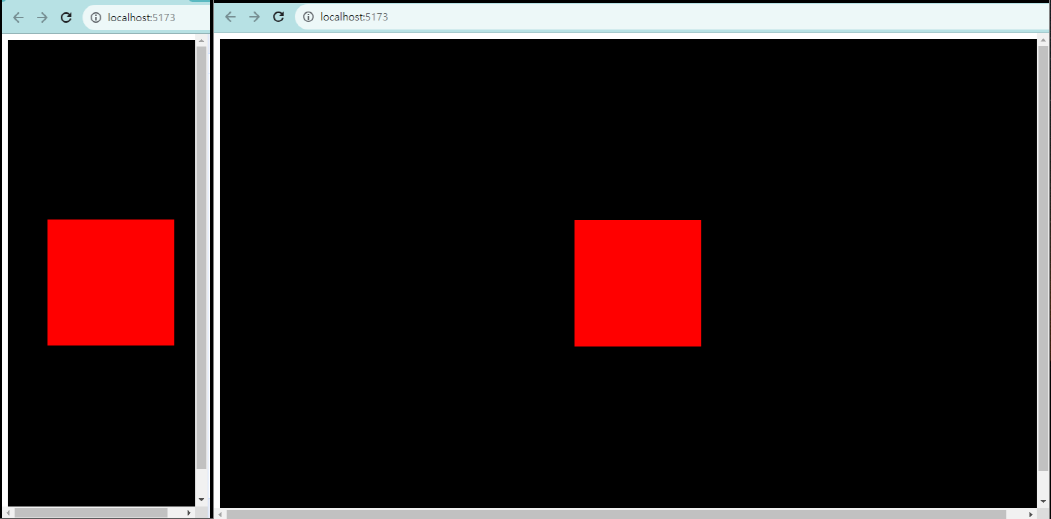 - 왼쪽처럼 창을 좁게 줄이거나, 오른쪽처럼 창을 늘렸을 때 캔버스의 크기가 따라서 변경되며 내부에 구현된 객체도 비율이 깨지지 않는 모습을 확인할 수 있다.