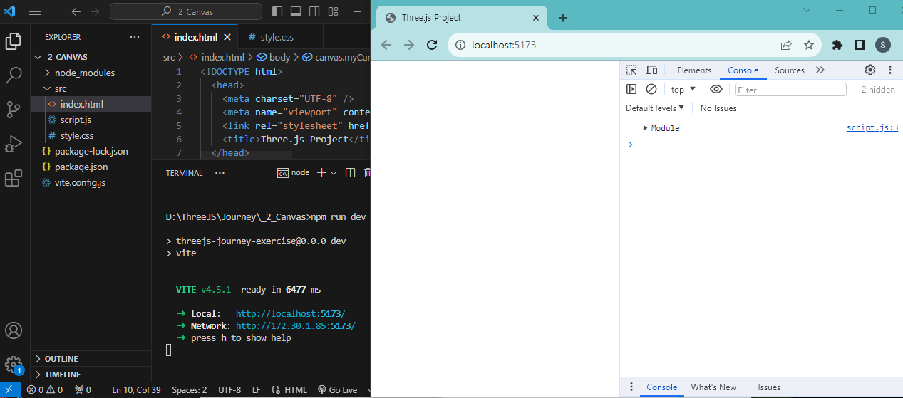 - 여기서 주의할 점은, three.js가 담겨 있는 <script> 태그가 <canvas> 태그 이전에 오도록 배치해야 한다.